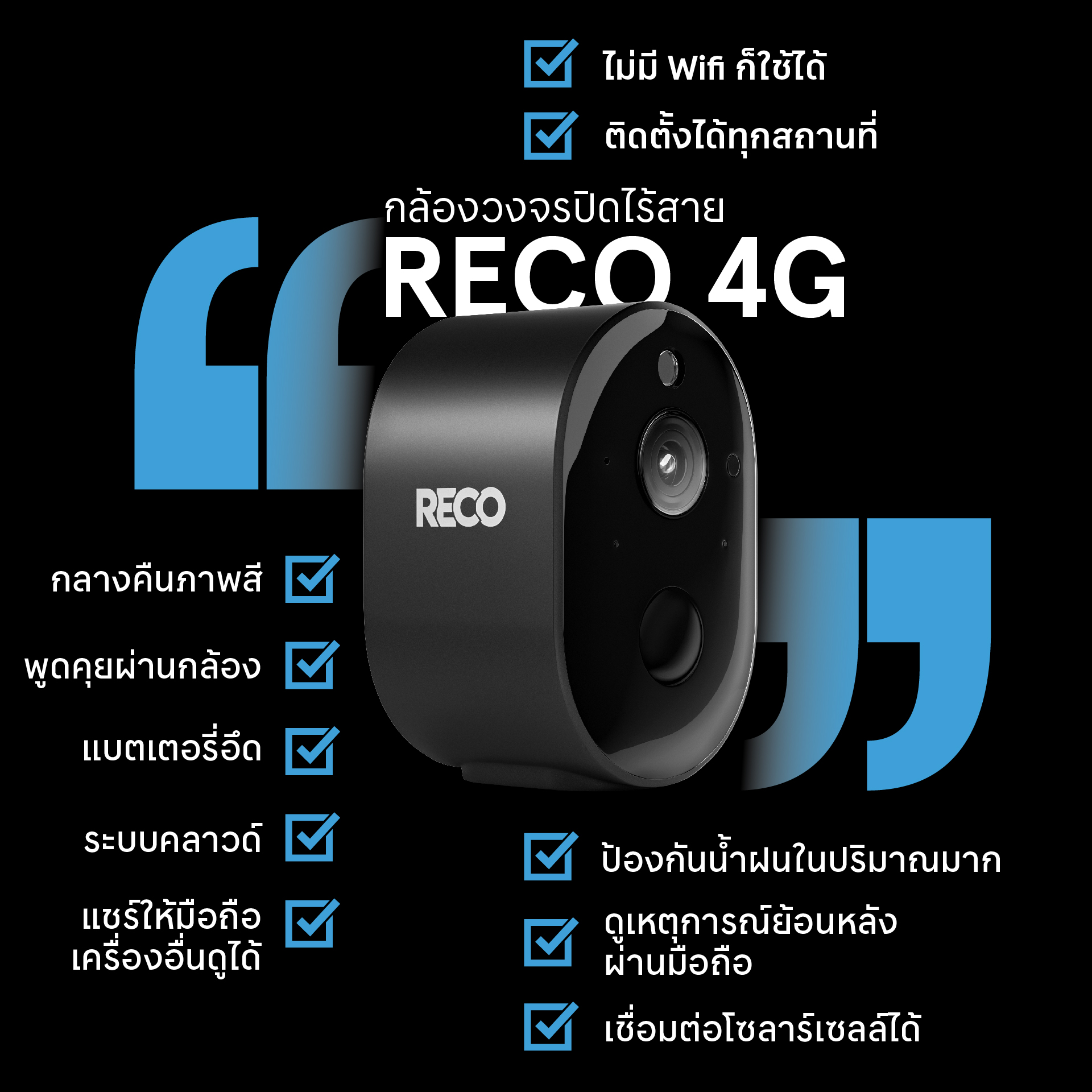 สำหรับคนที่กำลังมองหากล้องวงจรปิดสำหรับบ้านต่างจังหวัดที่ไม่มี WiFi กล้องวงจรปิดไร้สาย RECO 4G และ RECO 4G SOLAR ถือเป็นตัวเลือกที่ตอบโจทย์มาก เพราะตัวกล้องรองรับการใช้งานผ่านซิมการ์ด 4G/5G ติดตั้งง่าย ไม่ต้องต้องใช้ปลั๊ก ไม่ง้อช่าง ดูกล้องได้ผ่านแอปพลิเคชัน RECO ทั้งบน IOS & android ฟังก์ชันบนแอปครบ ดูย้อนหลังหรือเรียลไทม์ก็ได้ ตัวแอปเป็นภาษาไทย ใช้งานและติดตั้งง่าย เหมาะกับทั้งบ้านสวน บ้านพัก หรือพื้นที่ห่างไกลที่ต้องการความอุ่นใจตลอดเวลา