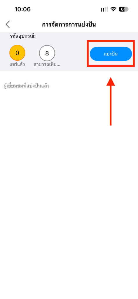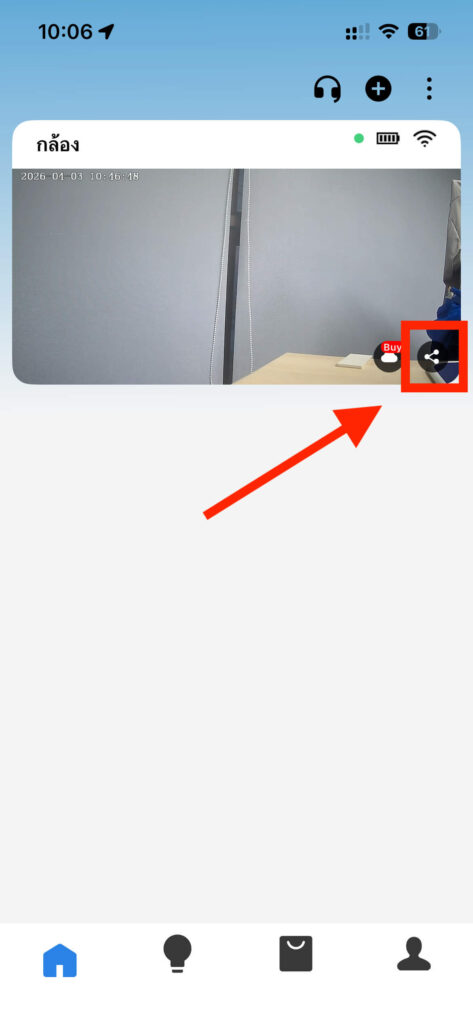 1. ให้เครื่องที่ต้องการแชร์กล้องเข้าไปที่หน้ารวมกล้องในแอป แล้วกดปุ่มแชร์ที่กล้องที่ต้องการแชร์