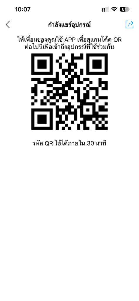 3. ระบบจะแสดง QR code ของกล้อง ให้อีกฝ่ายสแกน QR ผ่านมือถือ หรือจะกดปุ่มแชร์มุมขวาบนเพื่อแชร์รูปภาพ QR Code ก็ได้เช่นกัน