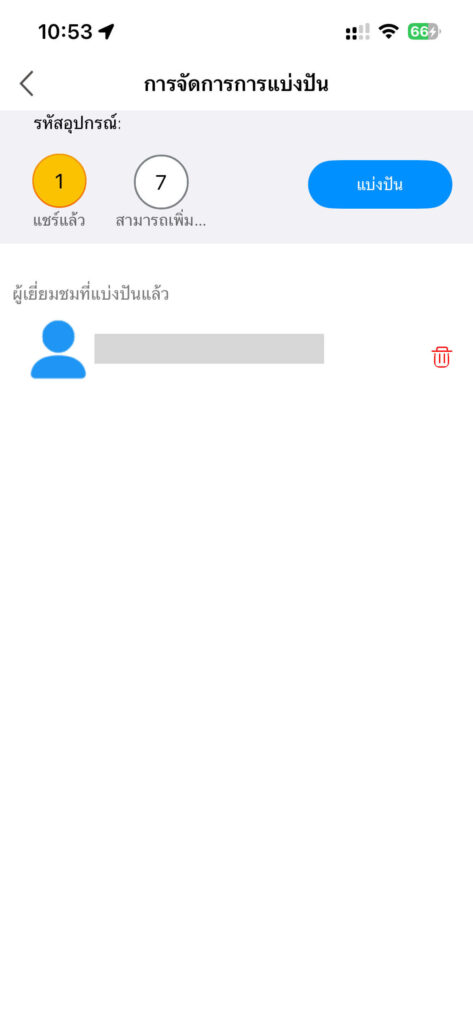 เมื่อเชื่อมต่อเรียบร้อยแล้ว ผู้ที่เป็นเจ้าของกล้อง (ผู้แชร์) จะสามารถตรวจสอบและจัดการอีเมลของผู้ที่ได้รับสิทธิ์เข้าดูได้ รวมถึงสามารถดูจำนวนอุปกรณ์ที่แชร์ไปแล้ว และจำนวนที่ยังสามารถแชร์เพิ่มเติมได้