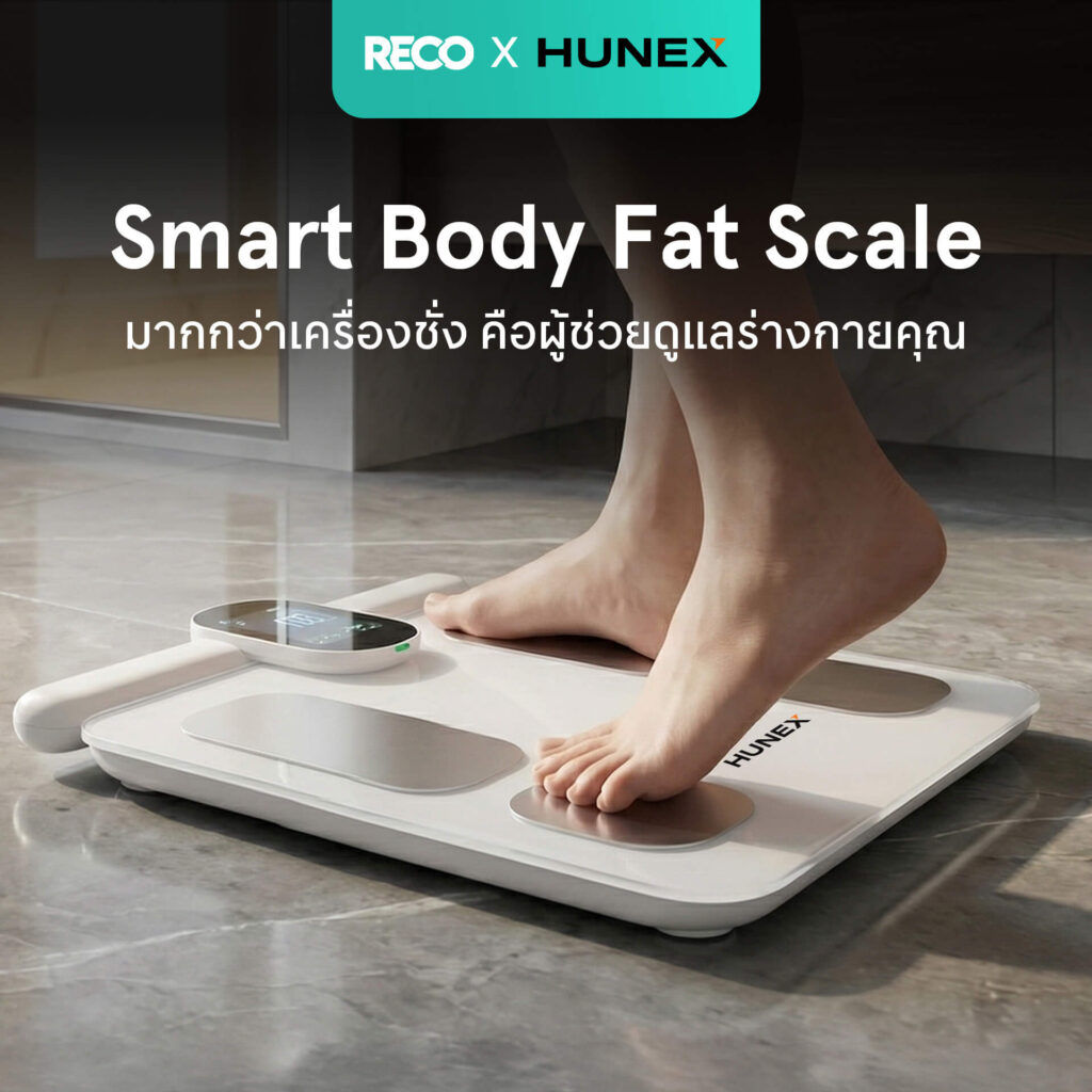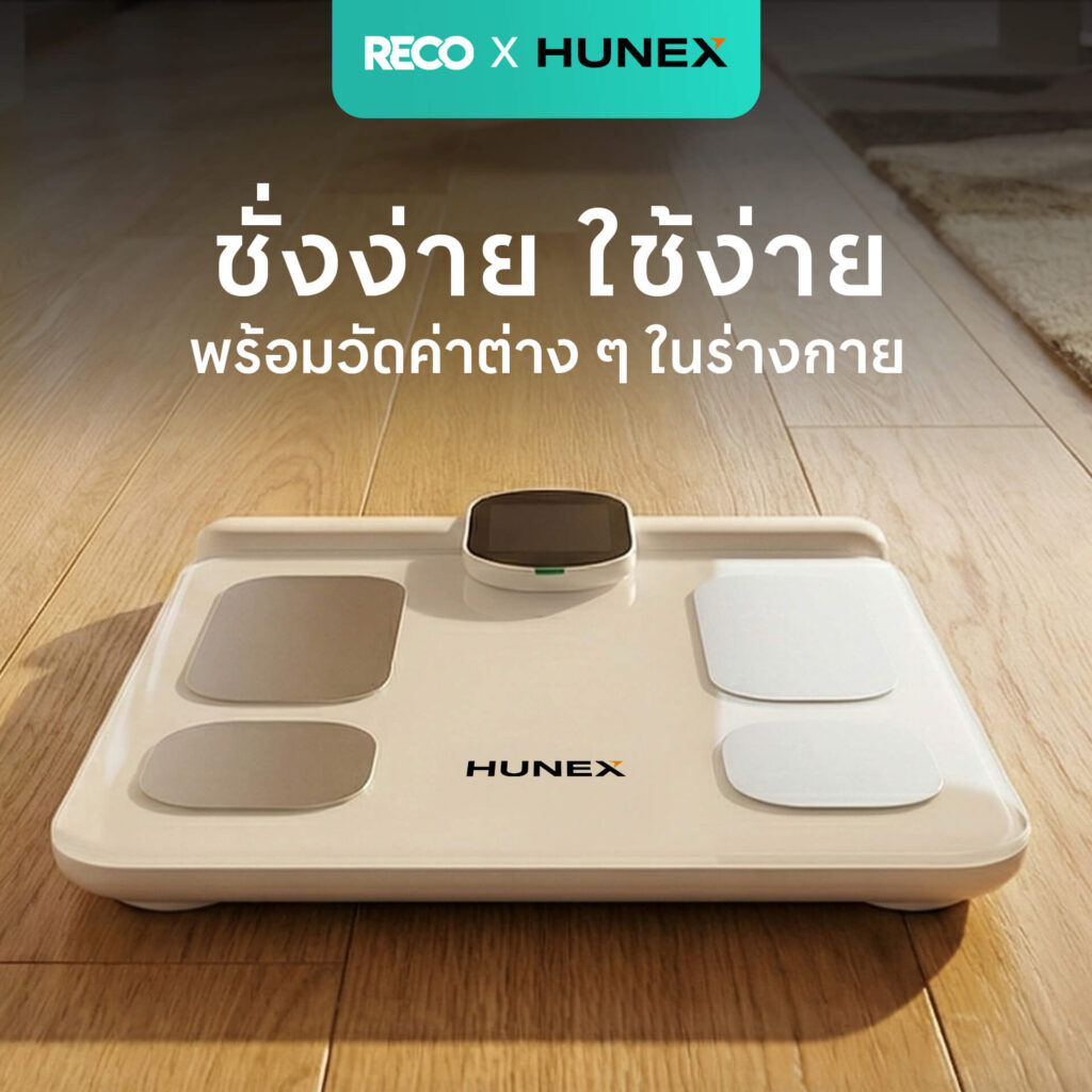 HUNEX Smart Scale คือเครื่องชั่งน้ำหนักอัจฉริยะที่ช่วยให้คุณเข้าใจร่างกายได้มากกว่าตัวเลขน้ำหนัก วิเคราะห์ข้อมูลสุขภาพร่างกายอย่างละเอียด ครอบคลุม ทั้งไขมัน กล้ามเนื้อ น้ำในร่างกาย และระบบเผาผลาญ เหมาะสำหรับผู้ที่ต้องการดูแลสุขภาพอย่างจริงจังในทุกวัน
